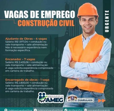 A Agência Municipal de Empregos de Guarulhos (Ameg) divulgou nesta quarta-feira (28) oportunidades na área da construção civil. São 12 vagas abertas e os interessados devem buscar atendimento em uma das unidades até as 16h30 do dia 7 de março. Caso as vagas atinjam o limite de encaminhamentos antes da data não serão mais aceitas inscrições.