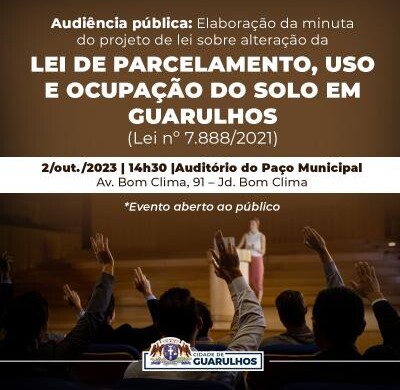 Uma audiência pública discutirá, na próxima segunda-feira (2), a minuta do projeto de lei sobre a alteração da lei 7.888/2021, que dispõe sobre o parcelamento, o uso e a ocupação do solo em Guarulhos. O evento, que acontecerá a partir das 14h30 no auditório do Paço Municipal, na avenida Bom Clima, 91, Jardim Bom Clima, é aberto ao público.