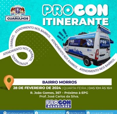 Os moradores do bairro Morros e imediações terão nesta quarta-feira (28) o atendimento da unidade móvel Procon Itinerante, que estará estacionada na rua João Gomes, 367, próxima à EPG Professor José Carlos da Silva, das 10h às 16h. O veículo da Coordenadoria de Proteção e Defesa do Consumidor de Guarulhos disponibiliza os mesmos serviços prestados nas unidades fixas e semanalmente atende em um bairro diferente.