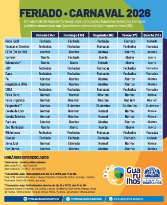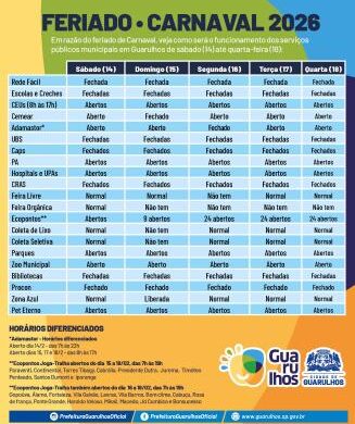 A Prefeitura de Guarulhos informou nesta quarta-feira (11) como será o funcionamento dos serviços públicos municipais durante o período de Carnaval, entre sábado (14) e quarta-feira (18). A medida impacta atendimentos em diferentes setores da administração.
