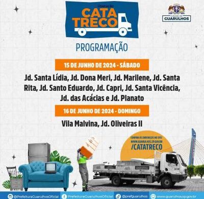 A Secretaria de Serviços Públicos alerta que a Cata-Treco não recolhe entulho, lixo doméstico e animais mortos. No site https://www.guarulhos.sp.gov.br/catatreco os moradores podem consultar os endereços contemplados e mais informações sobre como utilizar o serviço.