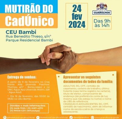 A primeira edição do mutirão do CadÚnico de 2024 acontecerá no dia 24 de fevereiro no CEU Bambi. O evento é promovido pela Prefeitura de Guarulhos e receberá a população das 9h às 14h para ofertar a realização de inscrições no Cadastro Único para Programas Sociais (CadÚnico), atualização de dados, solicitação de benefícios e orientações diversas.