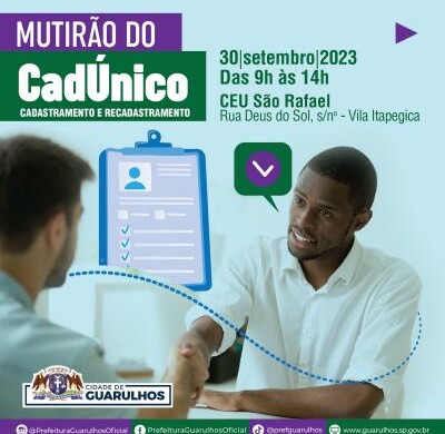 No último sábado do mês de setembro, dia 30, o CEU São Rafael abrigará a próxima edição do Mutirão do CadÚnico. O evento recebe a população entre 9h e 14h para novas inscrições no Cadastro Único para Programas Sociais e também para a atualização de informações previamente fornecidas.