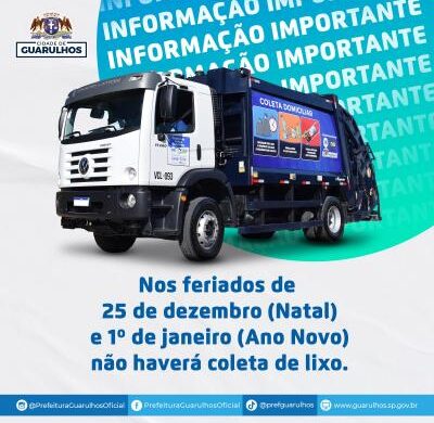 A Prefeitura de Guarulhos informa que não haverá coleta de lixo domiciliar nos dias 25 de dezembro (Natal) e 1º de janeiro de 2025 (Confraternização Universal). A suspensão do serviço permitirá que 450 trabalhadores celebrem essas datas especiais junto a seus familiares e amigos.