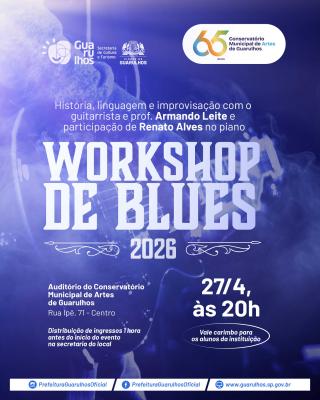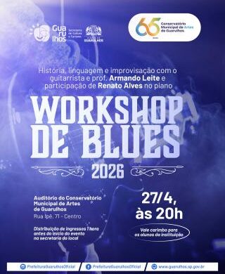 O Conservatório Municipal de Artes de Guarulhos realiza, no dia 27 de abril às 20h, o workshop “Blues – História, linguagem e improvisação”, voltado a músicos e público interessado em aprofundar conhecimentos sobre o gênero. A formação será conduzida pelo guitarrista e professor do conservatório, Armando Leite, com participação do pianista e também professor Renato Alves.