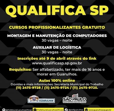 Até o dia 9 de abril estão abertas as inscrições para os cursos gratuitos do programa Qualifica SP em parceria com a Prefeitura de Guarulhos. São 60 vagas, divididas igualmente entre os cursos de montagem e manutenção de computadores e auxiliar de logística, ambos com aulas online no período noturno.