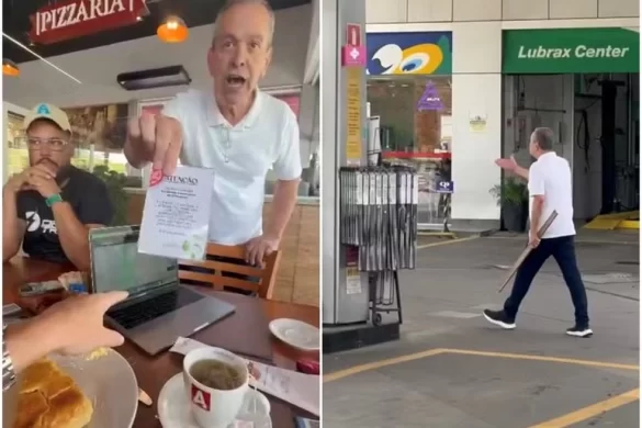 Enquanto tentava cometer a agressão, o homem, identificado como Silvio Mazzafiori, de 65 anos, tropeçou, caiu no chão e foi contido por conhecidos. Na sequência, ele fez uma série de ameaças ao empresário Alan Barros, de 32 anos. A cena foi registrada pelo cliente.