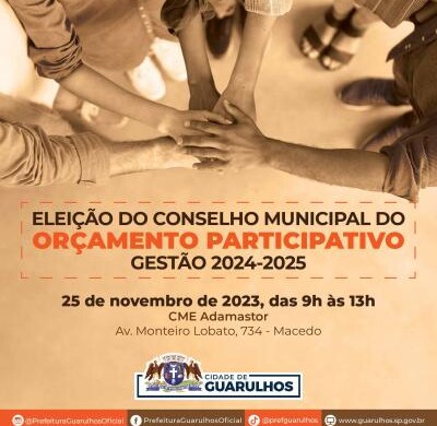 A Prefeitura de Guarulhos irá realizar neste sábado (25) a eleição do Conselho Municipal do Orçamento Participativo (CMOP) 2024-2025, das 9h às 13h, no Centro Municipal de Educação Adamastor, localizado na avenida Monteiro Lobato, 734, Macedo.