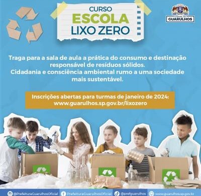 Estão abertas as inscrições para professores, coordenadores e gestores de ensino da rede pública e privada para o Curso Escola Lixo Zero Guarulhos 2024, que terá quatro turmas entre os próximos dias 16 e 26 de janeiro.