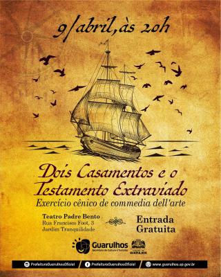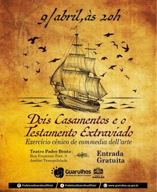 Na noite de quinta-feira, 9 de abril, às 20h, o Teatro Padre Bento recebe gratuitamente o espetáculo “Dois Casamentos e o Testamento Extraviado”, apresentado pelos alunos da Escola Viva de Artes Cênicas de Guarulhos. A encenação faz parte do processo de formação da turma de Interpretação e Jogo: Um olhar através da máscara teatral.