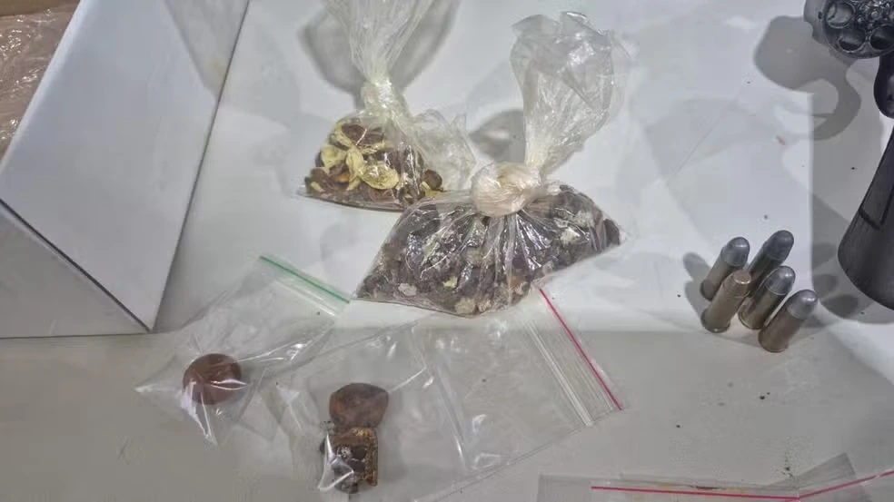 Na casa do funcionário do frigorífico, os agentes localizaram mais duas pedras de fel, outro revólver calibre .38 e cinco munições.