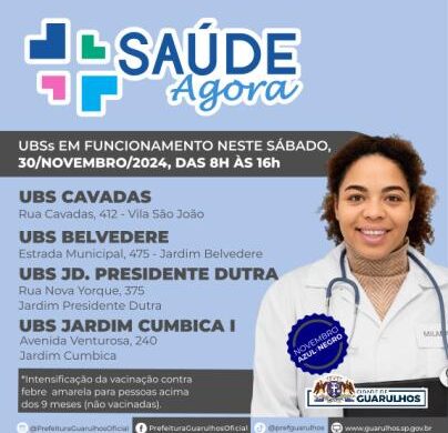 As Unidades Básicas de Saúde (UBS) Cavadas, Belvedere, Jardim Presidente Dutra e Jardim Cumbica I funcionarão neste sábado (30), das 8h às 16h, pelo programa Saúde Agora para oferecer serviços como consultas, exames e vacinação, inclusive contra a febre amarela, que no período entre dezembro e maio exige atenção redobrada devido ao aumento das chuvas e à consequente proliferação dos mosquitos transmissores.