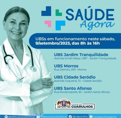 Quatro Unidades Básicas de Saúde (UBS) de Guarulhos estarão abertas no próximo sábado (9) para atender a população para consultas, exames e vacinação, inclusive contra a gripe, que teve a campanha prorrogada até o dia 15 de setembro devido à baixa cobertura vacinal entre o público-alvo. As UBS Jardim Tranquilidade, Morros, Cidade Seródio e Santo Afonso estarão em funcionamento das 8h às 16h pelo programa Saúde Agora.