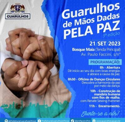 Nesta quinta-feira (21), Dia Internacional da Paz, a Prefeitura promove a terceira edição do Guarulhos de Mãos Dadas pela Paz na tenda principal do Bosque Maia, das 8h às 11h. O evento visa a sensibilizar a comunidade para a importância da paz, incentivando todos a refletir sobre como podem contribuir para a construção de um ambiente mais pacífico.