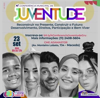 Neste sábado (23) será realizada a 4ª edição da Conferência Municipal de Juventude de Guarulhos, com o tema Reconstruir no Presente, Construir o Futuro: Desenvolvimento, Direitos, Participação e Bem Viver, das 8h às 17h, no Centro Municipal de Educação Adamastor. Promovida pelo Conselho Municipal da Juventude com o apoio da Prefeitura, a ação recebe inscrições de interessados em participar pelo link bit.ly/4ConferenciaJuventudeGru até a data do evento.