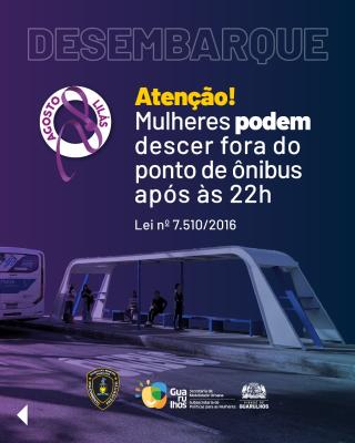 Em referência ao Agosto Lilás, mês de conscientização e combate à violência contra a mulher, a Prefeitura de Guarulhos, por meio da Secretaria de Mobilidade Urbana (Semob), intensificou a divulgação da Lei Municipal nº 7.510/2016. A norma garante às mulheres o direito de desembarcar fora do ponto de ônibus entre 22h e 5h, como forma de reforçar a segurança no trajeto de volta para casa.