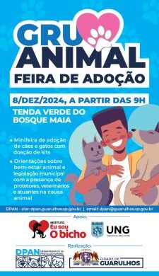 No dia 8 de dezembro, aniversário de 464 anos de Guarulhos, o Departamento de Proteção Animal de Guarulhos realiza mais uma edição do GruAnimal. O evento acontece das 9h às 12h na tenda verde do Bosque Maia e terá cães e gatos para adoção, doação de kits com ração e outros produtos, orientações sobre bem-estar animal e a legislação municipal com a presença de protetores e veterinários atuantes na causa animal.