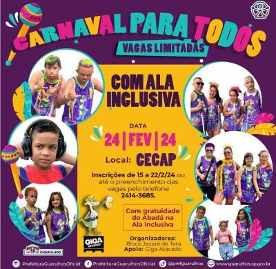 A Subsecretaria de Acessibilidade e Inclusão de Guarulhos recebe, a partir da próxima quinta-feira (15) até o dia 22, inscrições gratuitas de pessoas com todos os tipos de deficiência para participar do desfile de carnaval da ala inclusiva do Bloco Jacaré de Teta. Elas podem ser feitas pelo telefone 2414-3685 até o preenchimento das vagas. O período de inscrição foi alterado em razão do dia 12 cair durante o carnaval.