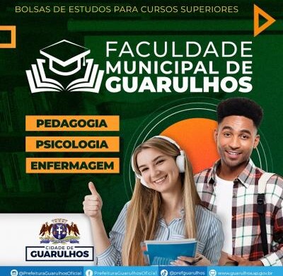 A Prefeitura de Guarulhos está com inscrições abertas até o próximo dia 19 para o Programa Faculdade Municipal de Guarulhos, que disponibiliza 150 bolsas de estudos integrais em cursos superiores à população em situação de vulnerabilidade residente no município há no mínimo dois anos, com renda familiar máxima de até dois salários mínimos, que tenha concluído o ensino médio e não possua ainda formação universitária. São oferecidas 50 bolsas de estudos para psicologia, 50 para pedagogia e 50 para enfermagem pelas instituições Eniac e Universidade Santo Amaro (Unisa).