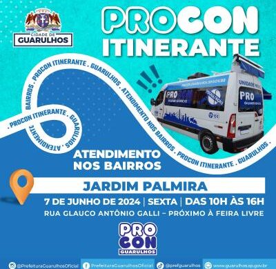 A unidade móvel do Procon Guarulhos estará nesta sexta-feira (7) na rua Glauco Antônio Galli, próximo à feira livre, no Jardim Palmira, para atender a população das 10h às 16h. O veículo da Coordenadoria de Defesa e Proteção do Consumidor de Guarulhos leva semanalmente a um bairro do município os mesmos serviços prestados nas unidades fixas do Procon.