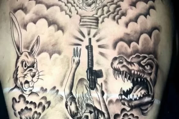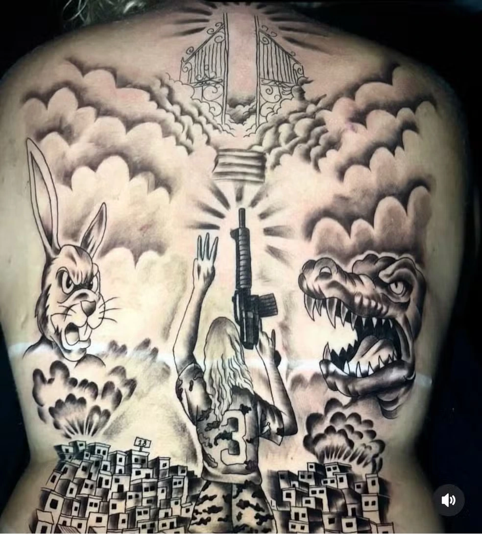 Após a mudança, fez uma tatuagem que cobre suas costas com referências ao Coelhão e também ao chefe da facção, Lacoste (jacaré), o traficante Wallace de Brito.