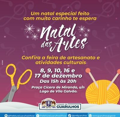 Nos dias 8, 9, 10, 16 e 17 de dezembro, das 15h às 20h, a praça Cícero de Miranda, no Lago de Vila Galvão, recebe o Natal das Artes, evento tradicional que integra o calendário de aniversário da cidade e as festividades natalinas. Realizado pela Prefeitura de Guarulhos por meio da Secretaria de Cultura, o Natal das Artes oferece diversidade de produtos manuais e artesanais, além de rica programação com atrações culturais. O evento é gratuito e tem classificação livre.