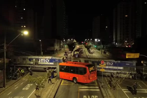 Ônibus biarticulado parte ao meio após colisão com trem em Curitiba e deixa 11 feridos