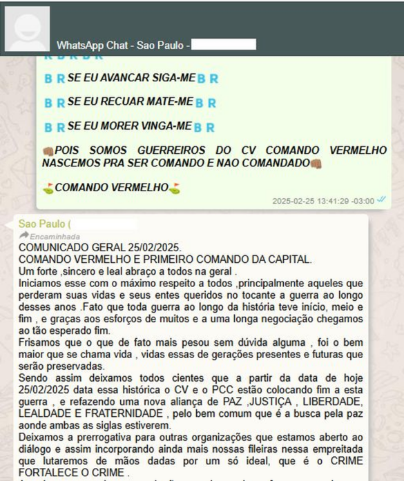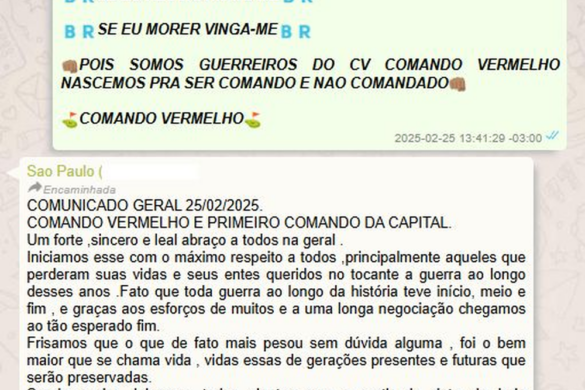 No comunicado, as facções afirmam que a data representaria um marco histórico para os grupos. “Deixamos todos cientes de que, a partir da data de hoje, 25/02/2025 — data essa histórica —, o CV e o PCC estão colocando fim a esta guerra e refazendo uma nova aliança”, diz um trecho da mensagem.