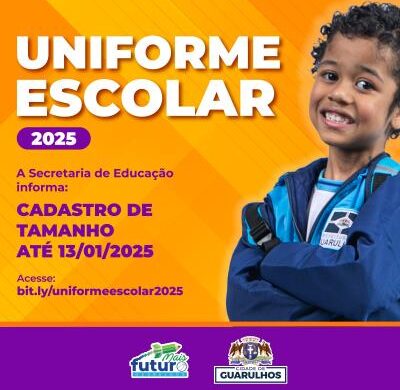 A Prefeitura de Guarulhos disponibilizou até o dia 13 de janeiro o sistema de coleta de dados e suprimentos escolares para que pais ou responsáveis pelas crianças insiram os tamanhos dos uniformes e tênis escolares necessários ao atendimento dos alunos matriculados na rede municipal no próximo ano.