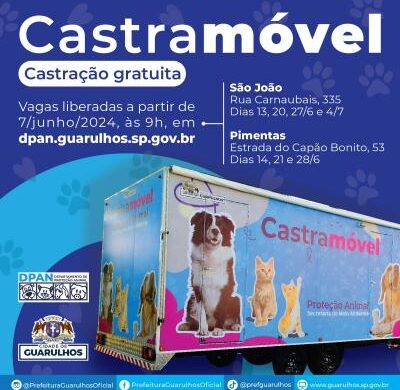 A Prefeitura de Guarulhos abre nesta sexta-feira (7) as inscrições para 1.765 mil vagas disponíveis na campanha de junho de castração gratuita de cães e gatos. Para tentar uma vaga é necessário realizar antecipadamente um cadastro para a obtenção de login e senha e acessar a página www.dpan.guarulhos.sp.gov.br/agendamento para dar sequência ao processo. Cada munícipe pode castrar até dois animais a cada seis meses.