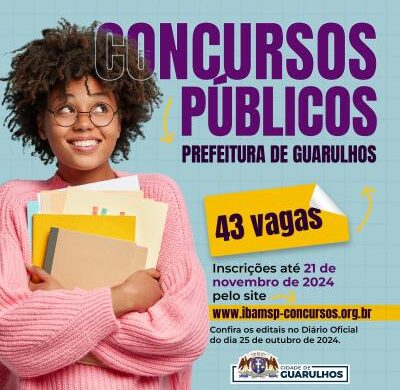 A Prefeitura de Guarulhos abriu concurso público para 43 vagas em 38 funções diferentes que vão do ensino fundamental completo, ensino médio completo ao superior, com salários de R$ 1.820,69 a R$ 6.871,11. As inscrições, cujas taxas variam de R$ 57,00 a R$ 120,00 conforme a função, devem ser feitas até o dia 21 de novembro pela internet no site do IBAM (www.ibamsp-concursos.org.br). Os editais completos podem ser consultados no link https://diariooficial.guarulhos.sp.gov.br/uploads/pdf/910200525.pdf.