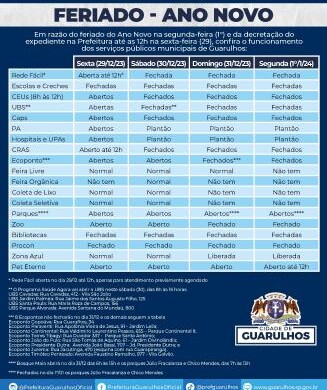 Em razão do feriado do Ano Novo na segunda-feira (1°) e do decreto que estabelece o expediente na Prefeitura até as 12h nesta sexta-feira (29), confira, ao lado, a tabela de funcionamento dos serviços públicos municipais de Guarulhos nesse período: