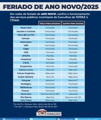Em razão do feriado de ano novo nesta quarta-feira (1º de janeiro) e do ponto facultativo nesta terça-feira (31) confira na tabela ao lado como será o funcionamento dos serviços públicos municipais de Guarulhos nesse período.