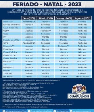 Em razão do feriado do Natal na segunda-feira (25) e da decretação do expediente na Prefeitura até as 12h na sexta-feira (22), confira o funcionamento dos serviços públicos municipais de Guarulhos. Veja ao lado ou no documento anexo abaixo: