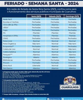 A Prefeitura de Guarulhos informa como será o funcionamento dos serviços públicos municipais no feriado desta sexta-feira (29) e por todo o fim de semana. Veja tabela ao lado e abaixo.