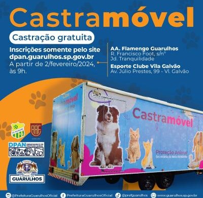A Prefeitura de Guarulhos abre nesta sexta-feira (2), às 9h, as inscrições para 1.775 vagas de cirurgia gratuita de castração de cães e gatos. Para tentar uma vaga é necessário realizar antecipadamente um cadastro para a obtenção de login e senha e acessar, no dia e hora já mencionados, a página www.dpan.guarulhos.sp.gov.br/agendamento para dar sequência ao processo. Cada munícipe pode castrar dois animais a cada seis meses.