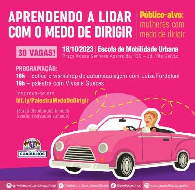 Enfrentar o trânsito nas ruas e avenidas de Guarulhos para muitos é uma missão fácil e prazerosa. Mas, para outras pessoas, ações simples como abrir um carro, dar a partida e engatar a marcha tornam-se um grande desafio. Para dirimir esse problema a Prefeitura de Guarulhos realizará em 18 de outubro, a partir das 18h, na Escola de Mobilidade Urbana, a palestra gratuita “Aprendendo a lidar com o medo de dirigir”.
