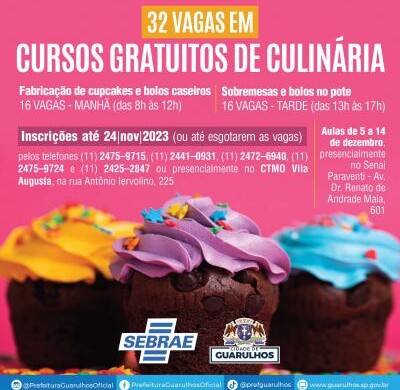 A Prefeitura de Guarulhos receberá até o dia 24 de novembro as inscrições para 32 vagas em cursos gratuitos de culinária. São 16 vagas para o curso de fabricação de cupcakes e bolos caseiros pela manhã (das 8h às 12h) e outras 16 para o curso de sobremesas e bolos no pote à tarde (das 13h às 17h).