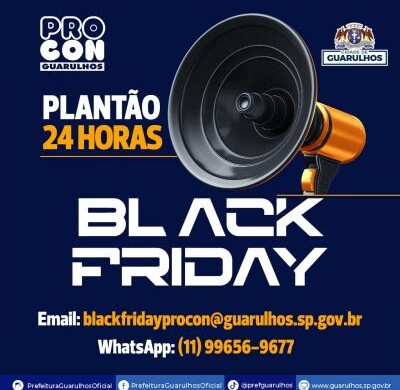 O Procon Guarulhos disponibilizará nesta sexta-feira (24) dois canais de atendimento 24 horas para receber denúncias de consumidores sobre a Black Friday: o e-mail blackfridayprocon@guarulhos.sp.gov.br e o WhatsApp (11) 99656-9677, nos quais o reclamante poderá anexar imagens e demais documentos. O consumidor também poderá contatar o Disque-Denúncia 151.