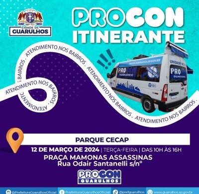 A unidade móvel Procon Itinerante estará nesta terça-feira (12) na praça Mamonas Assassinas (rua Odair Santanelli, s/nº), no Parque Cecap das 10h às 16h, para atender a população. O veículo da Coordenadoria de Proteção e Defesa do Consumidor disponibiliza os mesmos serviços prestados nas unidades fixas e semanalmente atende em um bairro diferente.