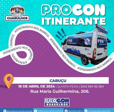 Na quinta-feira (18) a unidade móvel do Procon Guarulhos estará na rua Maria Guilhermina, 206, no Cabuçu, das 10h às 16h, para atender a população. Semanalmente o veículo da Coordenadoria de Defesa e Proteção do Consumidor leva a um bairro diferente do município os mesmos serviços prestados nos postos fixos do Procon.