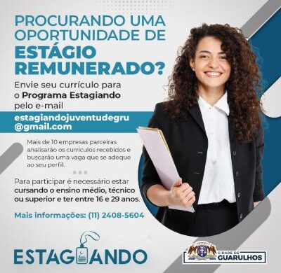 O programa Estagiando, da Prefeitura de Guarulhos, recebe currículos de jovens entre 16 e 29 anos que cursem o ensino médio, técnico ou superior para encaminhamento a estágios remunerados em empresas. O documento atualizado deve ser enviado ao e-mail estagiandojuventudegru@gmail.com.