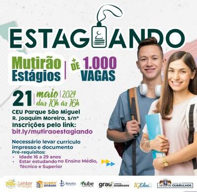 Na próxima terça-feira, dia 21, a Prefeitura de Guarulhos promove, das 10h às 16h, mais uma edição do projeto Estagiando – o mutirão de estádios remunerados – para o público entre 16 e 29 anos no CEU Parque São Miguel (rua Joaquim Moreira, s/nº). Interessados devem se inscrever pelo link bit.ly/mutiraoestagiando e comparecer ao local com o currículo impresso e documento de identidade.