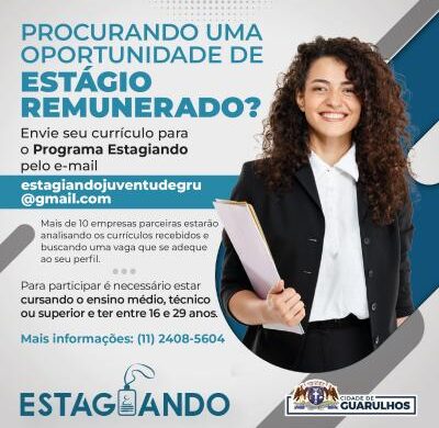 A Prefeitura de Guarulhos, por meio do projeto Estagiando, recebe currículos de estudantes entre 16 e 29 anos que cursem o ensino médio, técnico ou superior para encaminhamento a estágios remunerados em empresas. O documento atualizado deve ser enviado ao e-mail estagiandojuventudegru@gmail.com.
