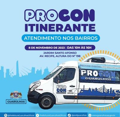 Nesta quarta-feira (8) a unidade volante do Procon Guarulhos estará na avenida Recife, altura do número 198, no Jardim Santo Afonso, das 10h às 16h, para atender a população. Semanalmente o veículo da Coordenadoria de Defesa e Proteção do Consumidor leva a um bairro diferente do município os mesmos serviços executados nos postos fixos do Procon.