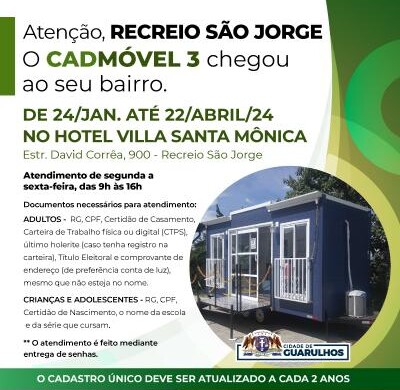 Entre os dias 24 de janeiro e 22 de abril o CadMóvel 3 atenderá a população no Recreio São Jorge. O equipamento móvel de assistência social receberá os munícipes de segunda a sexta-feira, das 9h às 16h, no Hotel Villa Santa Mônica, na estrada David Corrêa, 900.
