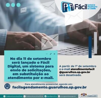 O e-mail da Rede Fácil de Atendimento ao Cidadão (atendimentofacil@guarulhos.sp.gov.br), utilizado pela população para o encaminhamento de documentos e solicitações, será desativado a partir das 17 horas desta sexta-feira (1º). A Prefeitura de Guarulhos irá substituí-lo por um novo sistema de solicitações de serviços, o Fácil Digital, que será o canal eletrônico de acesso do contribuinte aos serviços oferecidos pela municipalidade.
