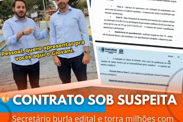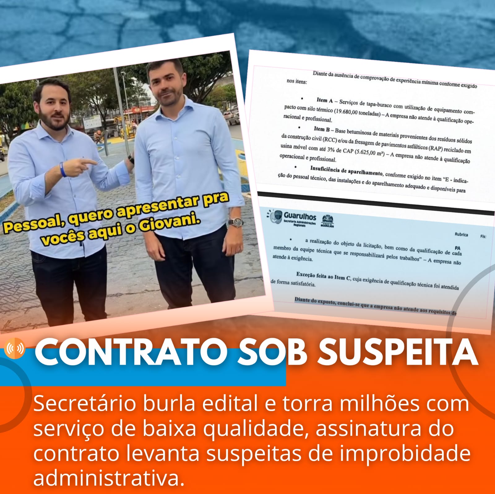 Giovanni Giudice Calderon, o secretário de Administrações Regionais, escolhido como o queridinho do prefeito Lucas Sanches (PL), assinou um contrato milionário com uma empresa em recuperação judicial, com sede no Rio de Janeiro, onde se envolveu em diversos escândalos junto a administração pública. Em Guarulhos, a empreiteira ganhou a licitação para a realização de serviços de tapa-buracos, mesmo com análise técnica decidir por sua desabilitação do certame.