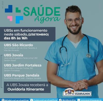 No próximo sábado (2) a Prefeitura de Guarulhos abrirá quatro Unidades Básicas de Saúde (UBS), das 8h às 16h, para atender a população pelo programa Saúde Agora, que prevê o funcionamento de uma ou mais unidades aos sábados em sistema de rodízio. As UBS abertas serão São Ricardo, Jardim Fortaleza, Parque Jandaia e Jovaia, sendo que esta última receberá a terceira edição da Ouvidoria Itinerante.