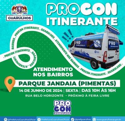 A unidade volante do Procon Guarulhos estará nesta sexta-feira (14) na rua Belo Horizonte, próxima à feira livre, no Parque Jandaia (região do Pimentas), das 10h às 16h, para atender a população. Toda semana o veículo da Coordenadoria de Defesa e Proteção do Consumidor leva a um bairro diferente do município os mesmos serviços executados nas unidades fixas do Procon.